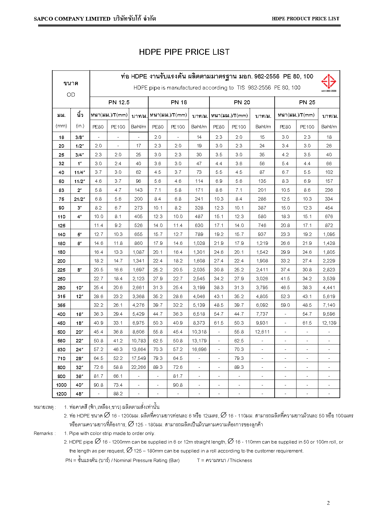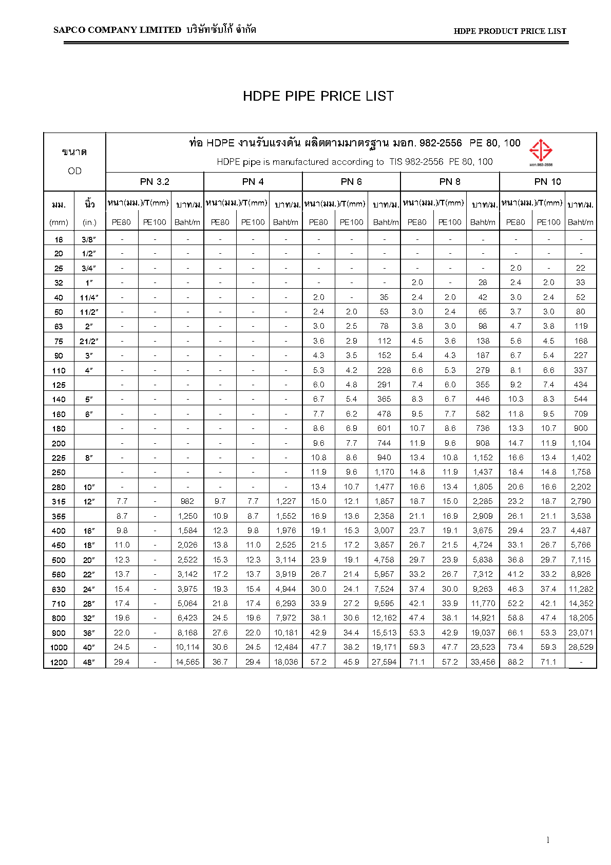 ตารางขนาดท่อ HDPE